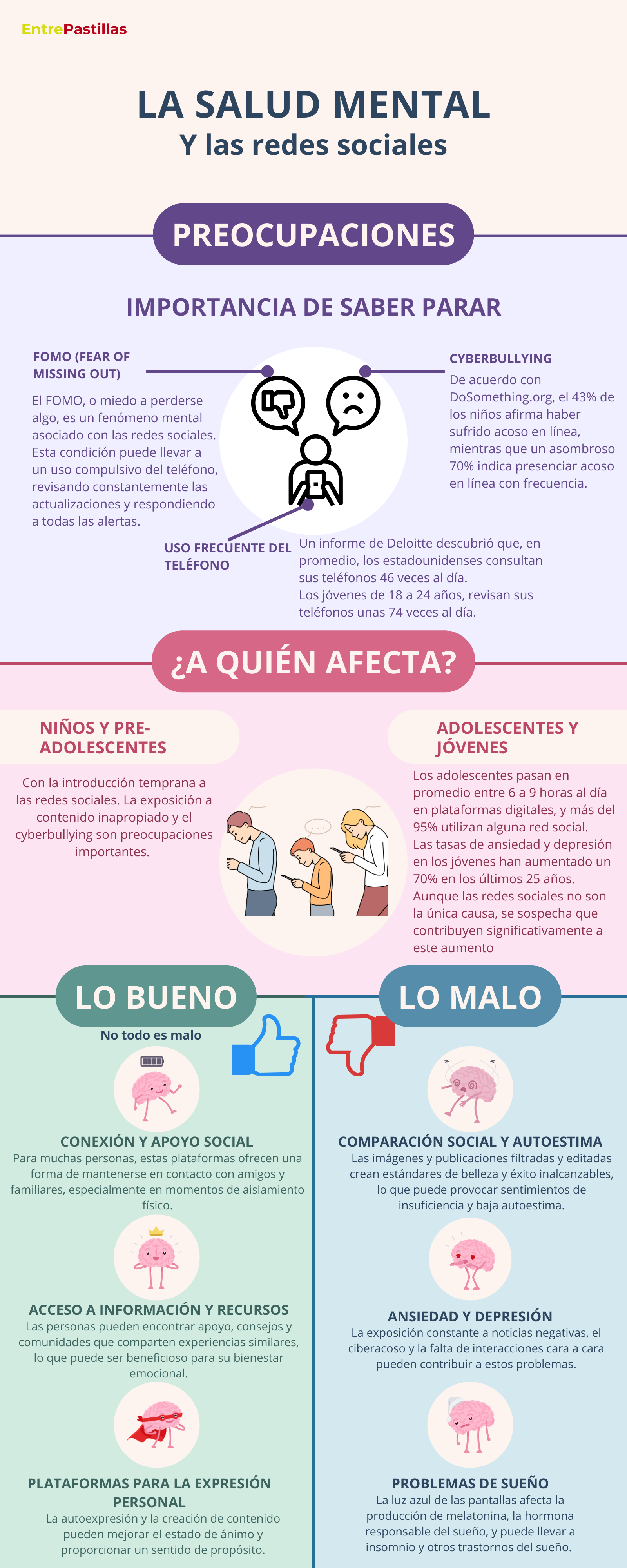 A pesar de estos beneficios, el impacto negativo de las redes sociales en la salud mental es una preocupación creciente. Los estudios han demostrado que el uso excesivo de redes sociales puede estar relacionado con un aumento en los niveles de ansiedad, depresión y problemas de sueño. La constante comparación social, facilitada por las imágenes cuidadosamente curadas y los logros exagerados que se muestran en estas plataformas, puede llevar a sentimientos de insuficiencia y baja autoestima.
