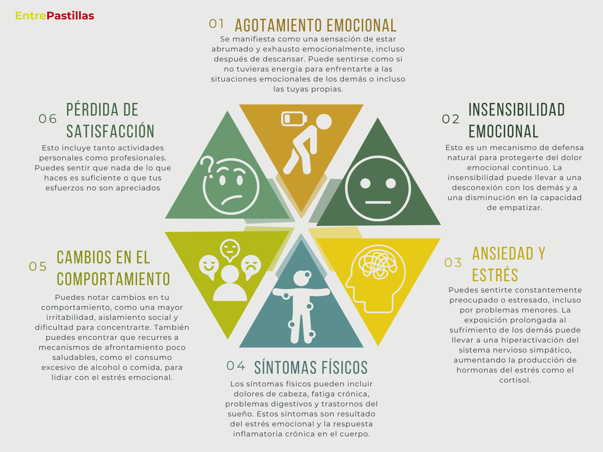 3. Agotamiento Emocional: La constante activación emocional y la necesidad de empatizar con el sufrimiento ajeno pueden llevar a un agotamiento emocional. Esto se caracteriza por una disminución en la capacidad de experimentar empatía y una tendencia a distanciarse emocionalmente de los demás como mecanismo de defensa .